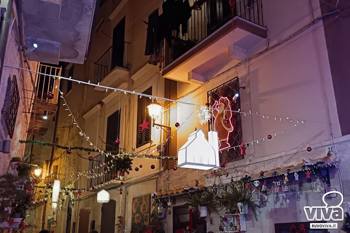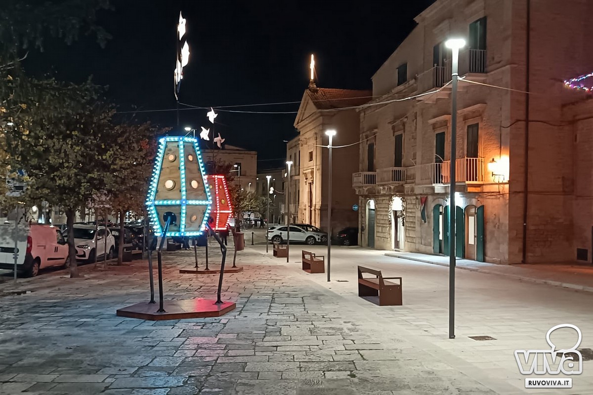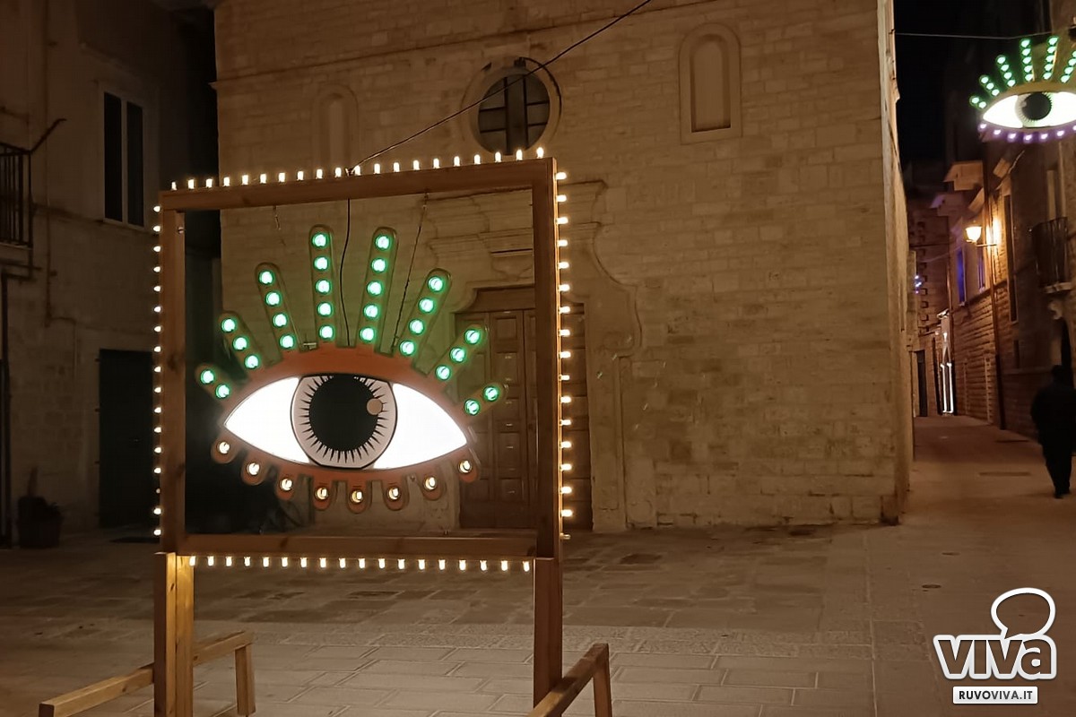 Il percorso luminoso si snoda tra le vie del centro storico, ridando vita a oltre 350 opere realizzate nelle passate edizioni: farfalle luminose in via Alcide De Gasperi, acchiappasogni in piazza Menotti Garibaldi e via Vittorio Veneto, funamboli in via Cattedrale e il grande rosone luminoso di Largo Cattedrale dialogano con quello della Cattedrale romanica. Via Santa Caterina brilla con occhi luminosi, mentre Piazza Dante accoglie giochi, altalene e animali fantastici, con il Cavallufalo che vigila sul Museo Nazionale Jatta.