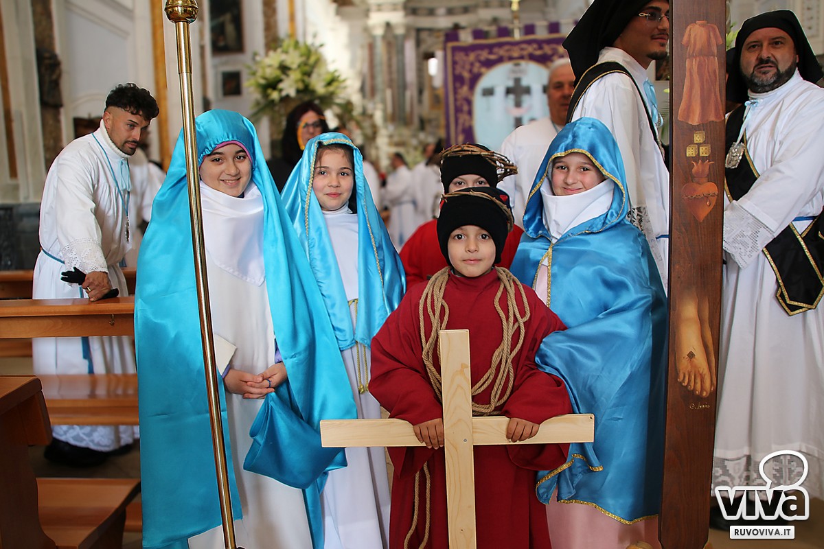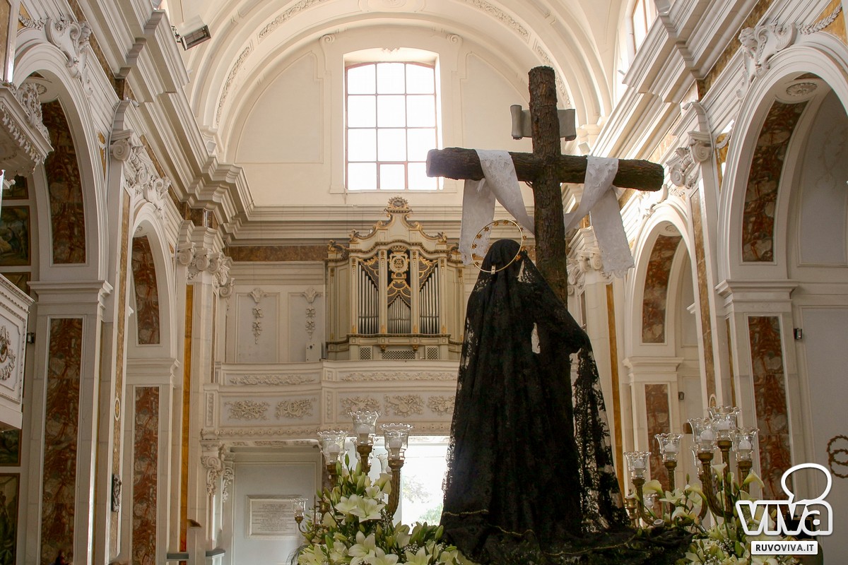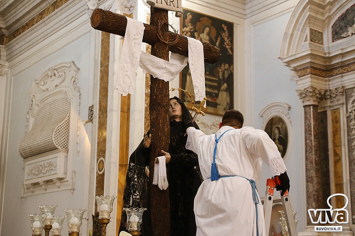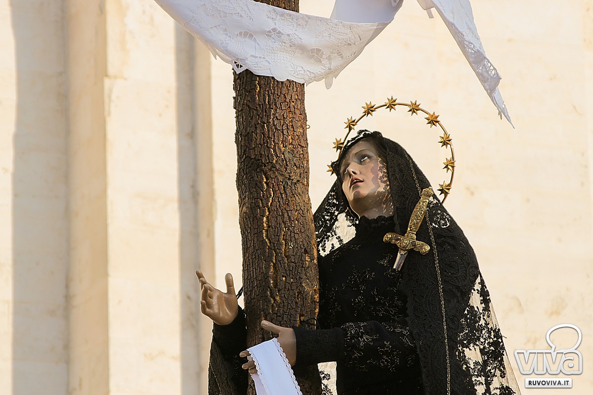 Dalla chiesa di San Domenico, alle 17.30, è partita la statua del 1907, che raffigura la Madonna in abiti neri, ai piedi della croce e col petto trafitto da un pugnale, simbolo eterno del dolore materno davanti al sacrificio di Cristo.