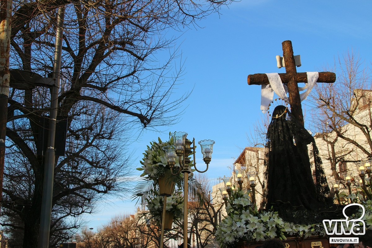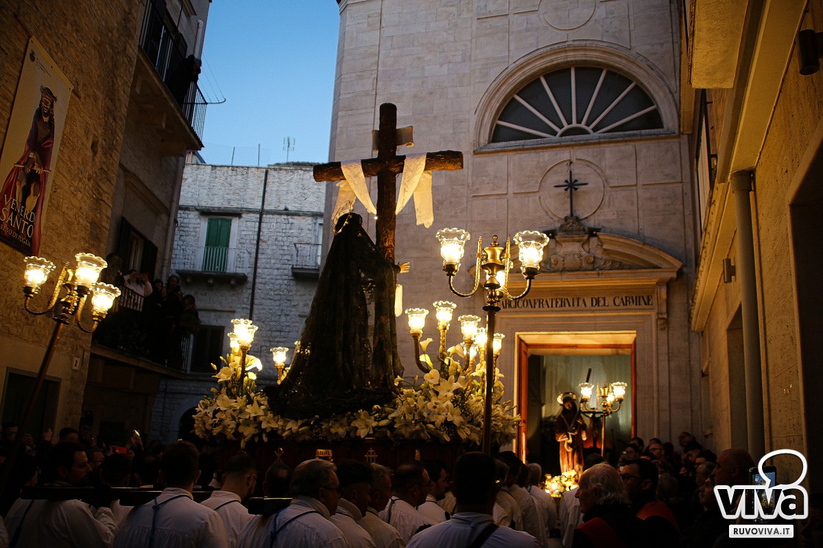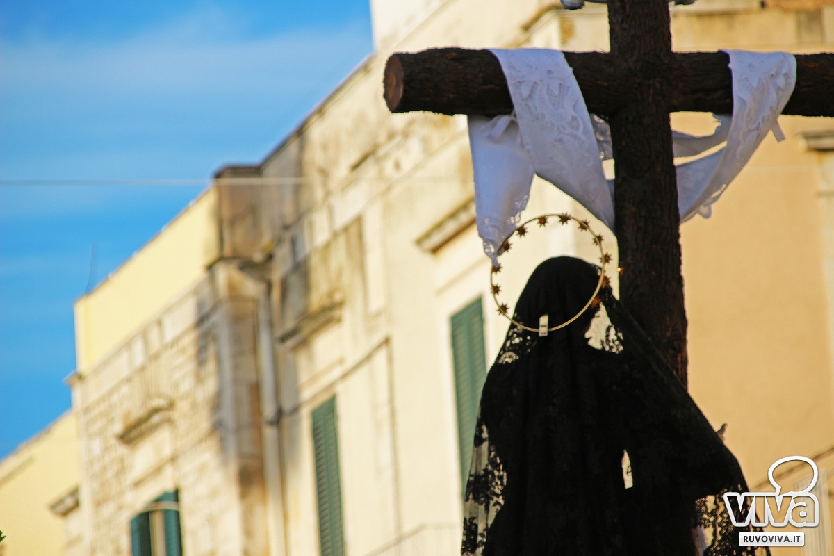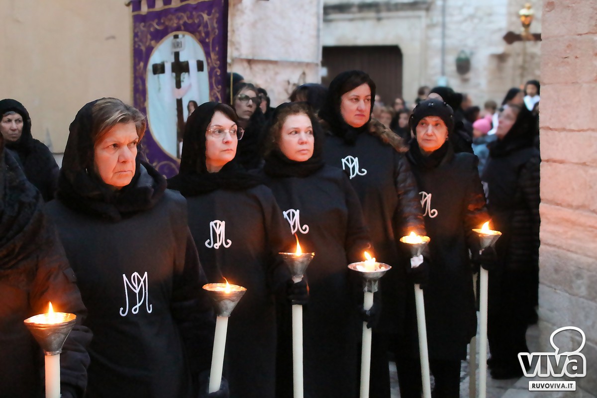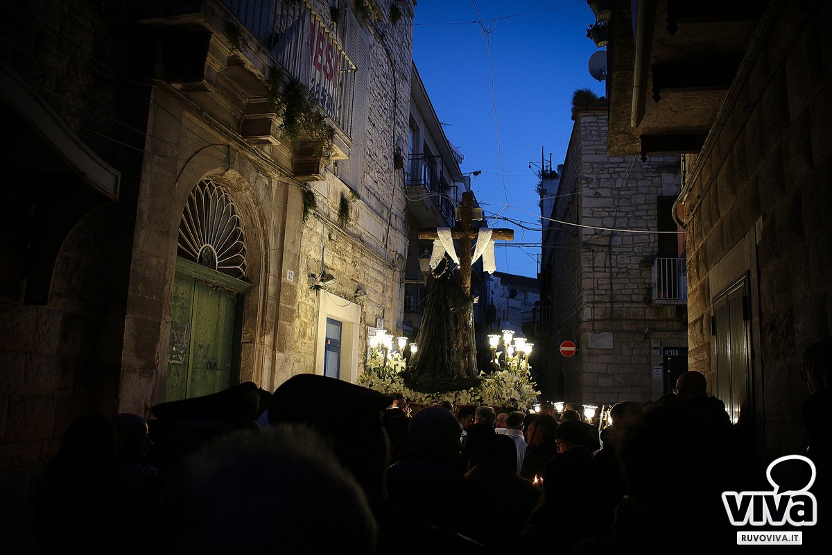 Conosciuta dai ruvesi come la processione della "Madonna del vento", la sacra immagine ha percorso le strade principali della città, accompagnata dal silenzio rispettoso dei fedeli. Al calar della sera, le luci urbane si sono spente, lasciando spazio a un'atmosfera sospesa e intensa; le fiammelle dei ceri illuminavano il cammino, mentre lenzuola bianche sventolavano dai balconi, richiamo alla sindone che avvolse il corpo di Cristo.