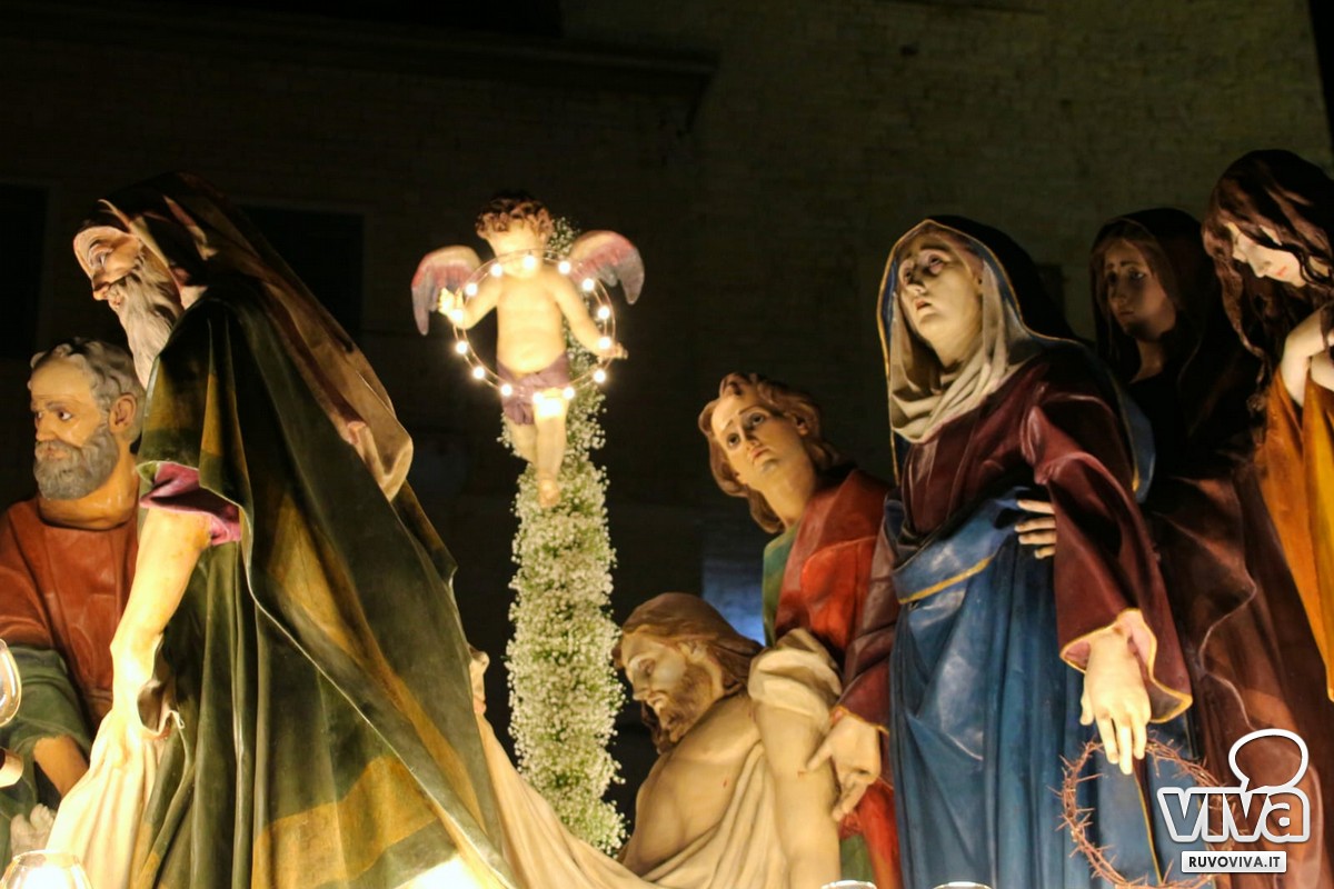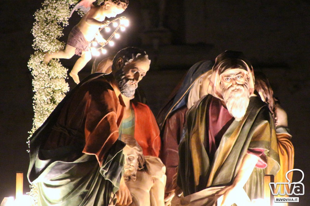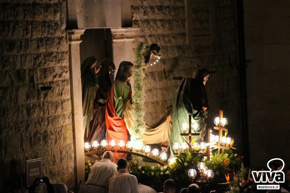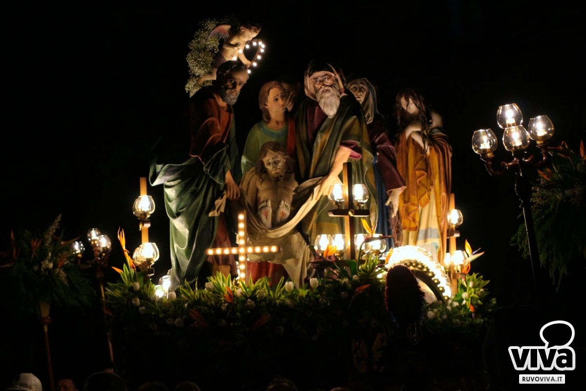 Alle 2:30, quando la città dorme e le strade sono appena illuminate dai lampioni, dalla chiesa di San Rocco si apre il portale del mistero. È l'uscita del gruppo statuario della Deposizione, momento culminante di una tradizione che unisce e commuove.