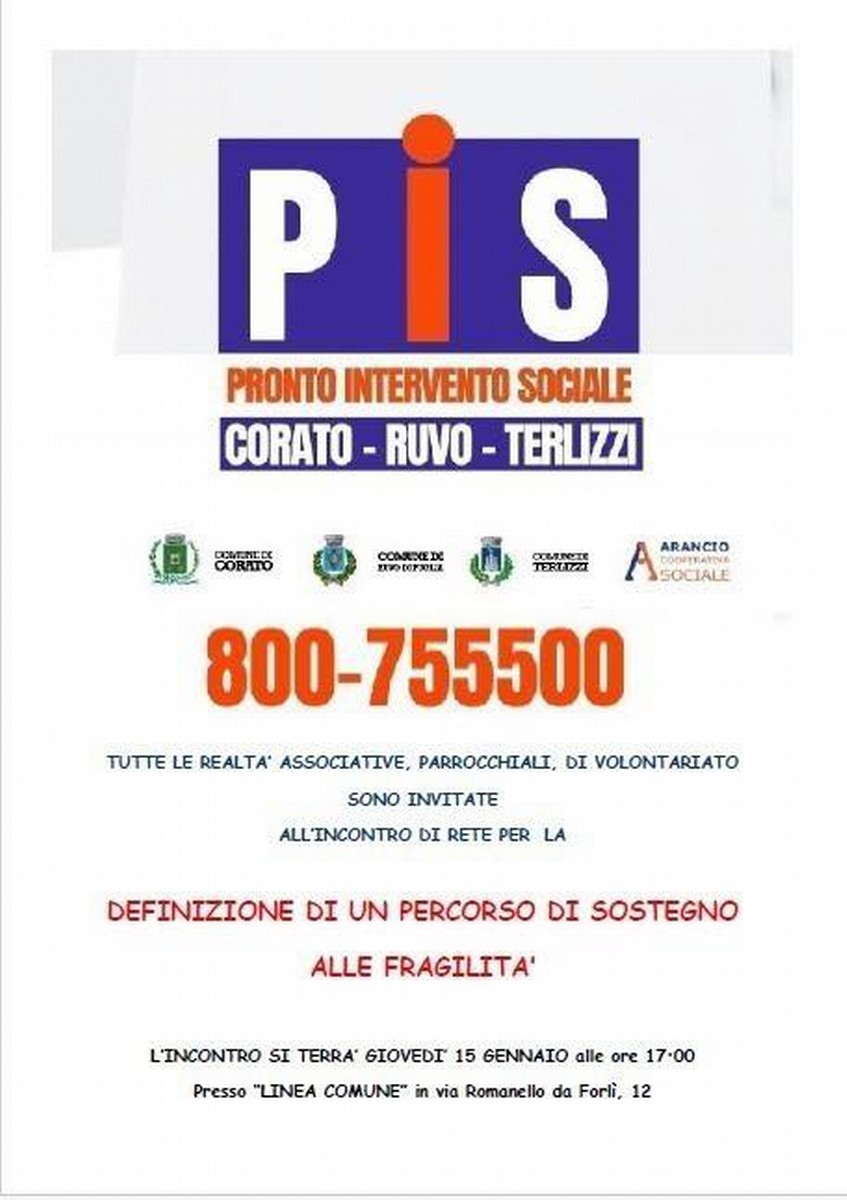 Il Pronto Intervento Sociale è un servizio di emergenza sociale attivo h 24, che fornisce supporto immediato a persone in situazioni di grave bisogno di intervento sociale offrendo ascolto, valutazione e attivazione di risorse territoriali urgenti. Si tratta di un servizio gratuito gestito tramite numeri verdi specifici - 800755500 per l'area di Corato – Ruvo di Puglia e Terlizzi - per garantire assistenza al di fuori degli orari dei servizi sociali ordinari.