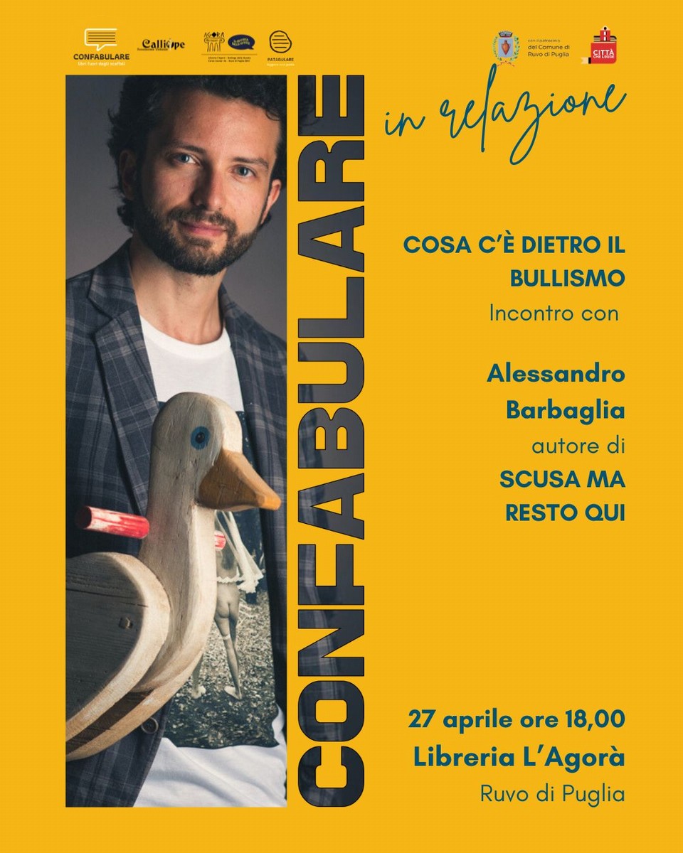 Gli appuntamenti di Confabulare in relazione non sono finiti! Grazie al libro Scusa ma resto qui, ed. Mondadori, affronteremo insieme il tema del bullismo, argomento tristemente centrale nelle vite delle nostre ragazze e ragazzi. L'ospite è Alessandro Barbaglia, scrittore e libraio, per Mondadori ha pubblicato La Locanda dell'Ultima Solitudine, finalista al premio Bancarella, Con il suo primo libro per ragazzi, nel 2021 ha vinto il premio Strega Ragazze e Ragazzi.