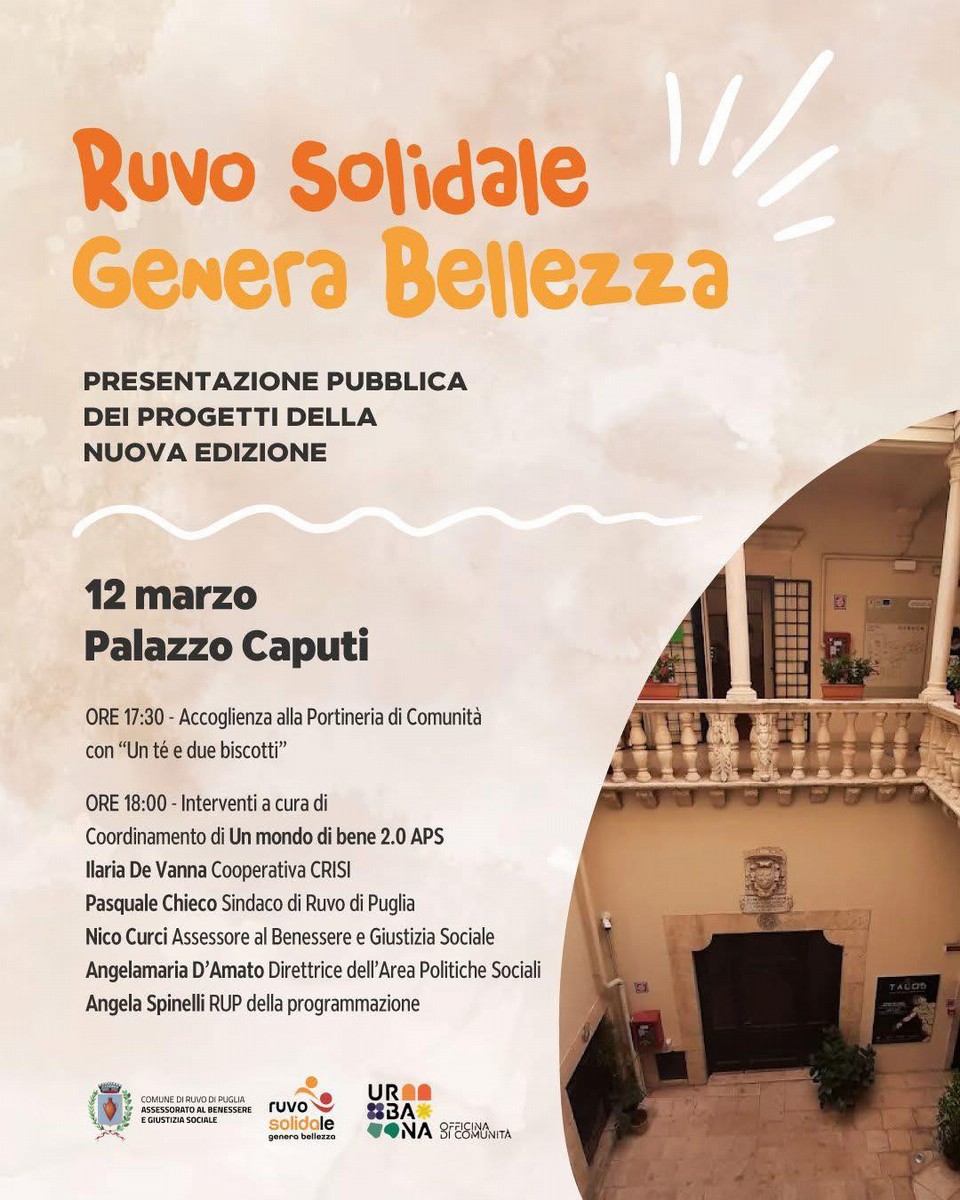 Giovedì 12 marzo, a Palazzo Caputi dalle ore 17:30, verranno presentati i progetti vincitori della nuova edizione di Ruvo Solidale Genera Bellezza, il programma del Comune che promuove le attività di inclusione sociale realizzate sul territorio dal terzo settore, dai volontari, dagli oratori e dalle scuole.