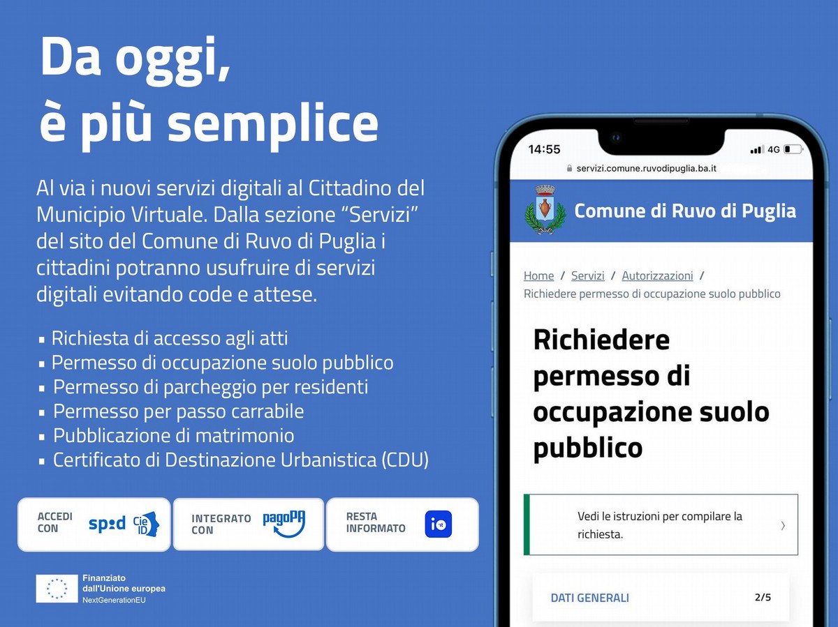Il Comune di Ruvo di Puglia ha attivato in questi giorni sei nuovi servizi digitali per i cittadini. Nella sezione "Servizi" del sito del Comune, all'interno della piattaforma online del Municipio Virtuale, sarà ora possibile richiedere l'accesso agli atti per procedure pubbliche, l'occupazione del suolo pubblico, parcheggi per residenti, permessi per passi carrabili, pubblicazioni di matrimonio e Certificati di Destinazione Urbanistica.