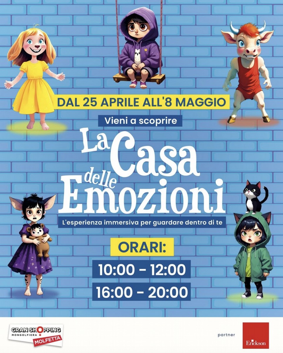 Le emozioni vivono in noi da sempre e ci accompagnano in ogni momento della nostra vita, e da venerdì 25 aprile e fino all' 8 maggio sarà possibile esplorarle tutte nella "Casa delle Emozioni" del Gran Shopping Molfetta. Il centro commerciale di Molfetta ospiterà il progetto nazionale realizzato in collaborazione con Edizioni Centro Studi Erickson pensato per bambini e famiglie che, grazie alla Digital Emotion Room, permetterà di guardare dentro di sé e di scoprire il magico mondo delle emozioni ogni giorno, dalle 10 alle 12 e dalle 16 alle 20 in piazza Ottagono (ingresso centrale).